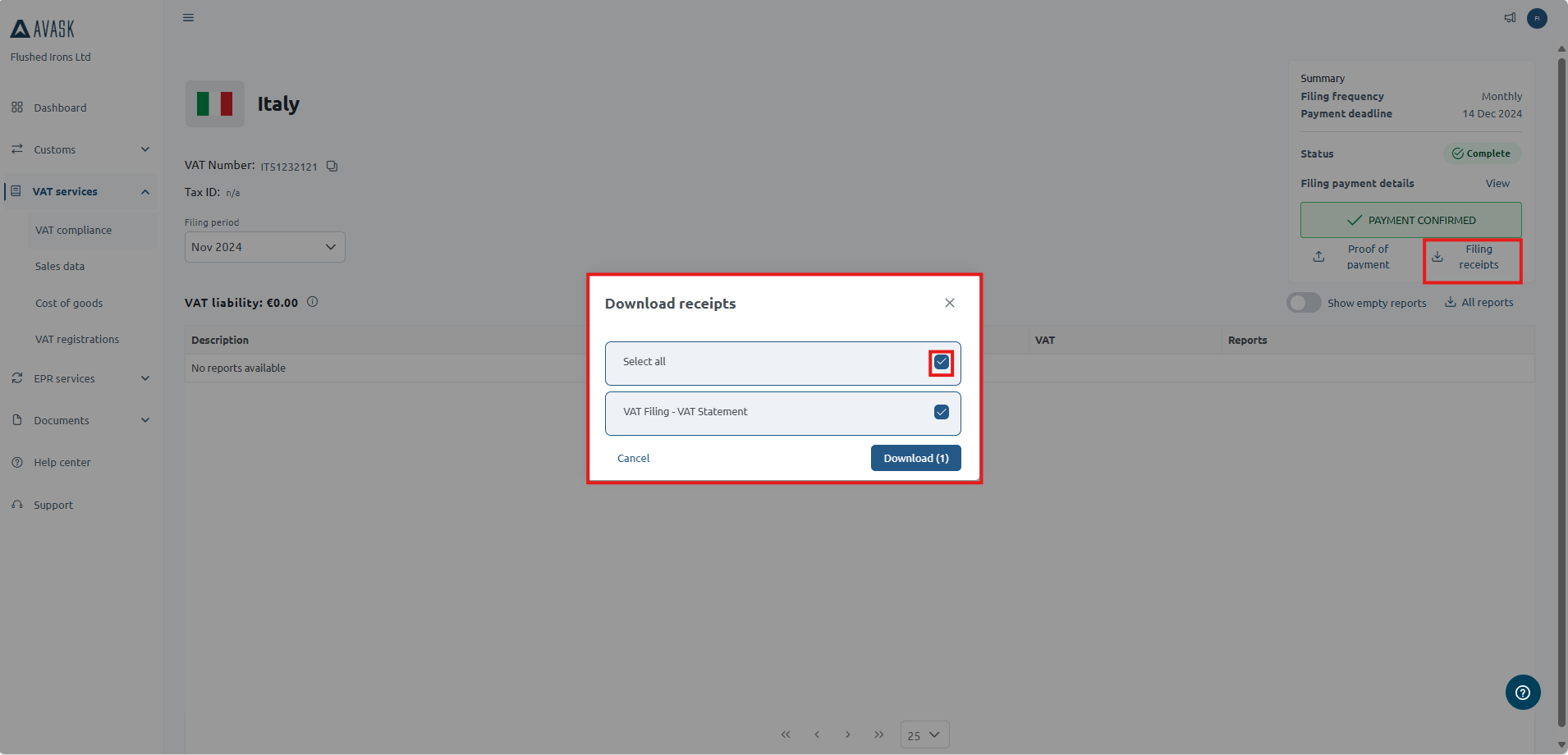 You can easily download your VAT filing receipts directly from the Filing Summary screen. Follow the steps below: